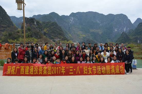 南宁总部女同胞在农庄玩的不亦乐乎,百色总部女同胞们的活动也是精彩不断。早上八点半,百色的女胞们在建通创业大厦集合,乘坐大巴车前往风景秀美的凌云县浩坤湖景区。上午十时,大巴车抵达景区。大家被秀丽的美景所吸引,在蓝天绿水的映衬下,女同胞们各个光彩照人,煞是好看。上午十点半,大家开始了期待已久的户外扩展活动。本次拓展活动分五项,分别是拔河、比比谁最快、隔空投球、双人夹球、空中套圈。欢乐活泼的比赛现场,呐喊声和加油声响彻景区,激烈的比赛所迸发出来的昂扬斗志激励着每一个人。拓展活动结束后,之后全体人员乘坐游轮游览了浩坤湖景区,和碧绿的湖水来了次亲切邂逅。下午两点,在短暂的聚餐结束后,一天的活动也接近了尾声,大家依依不舍地告别了美丽的浩坤湖,期待着来年的再次相聚。